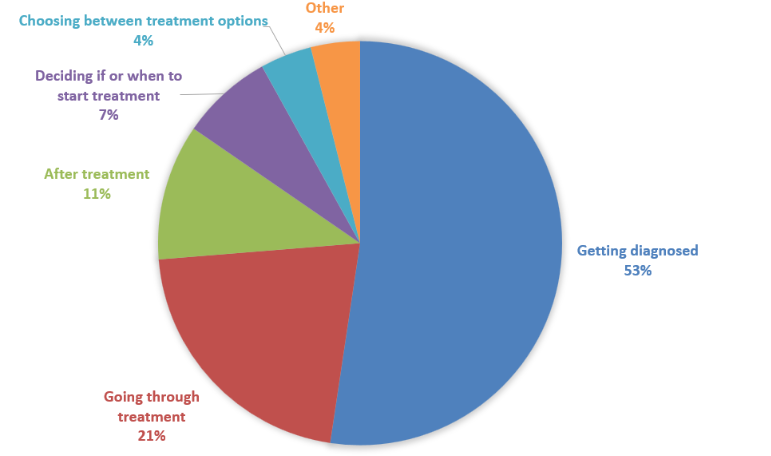 Others identified later stages as more difficult, including going through treatment (20%), after treatment (10%), starting treatment (7%), or choosing between treatments (4%). These moments often bring new decisions and renewed concerns.